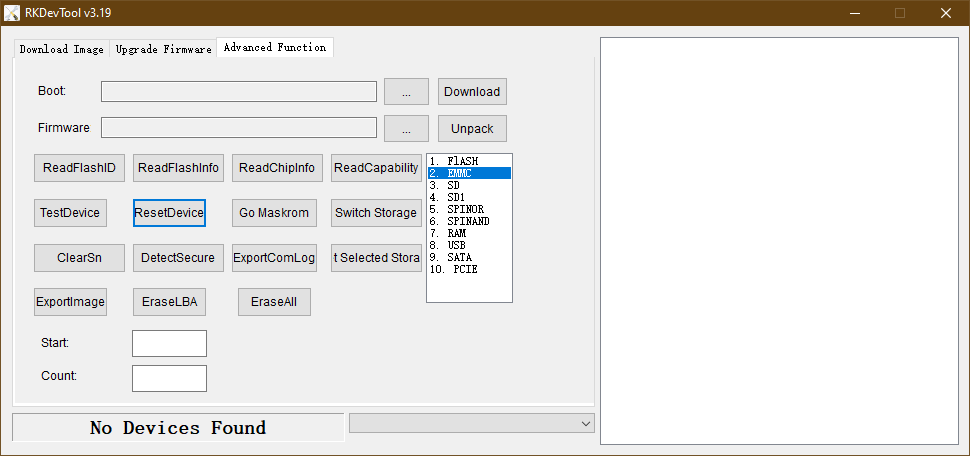 Rockchip offers the RKDevTool as a fundamental development tool for Windows and MacOS, and the Linux Upgrade Tool for Linux. A loader will be needed to be able to flash the backup image to the board. Download the loader from this link. Using this tool will flash the board and erase all previous data.